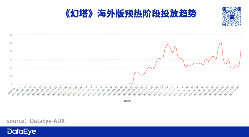 从投放量来看,《幻塔》预热相对强势。根据DataEye-ADX海外版数据显示,《幻塔》海外版预热阶段投放量力度适中,单日峰值超过120组素材,而且在投放波动上较大。