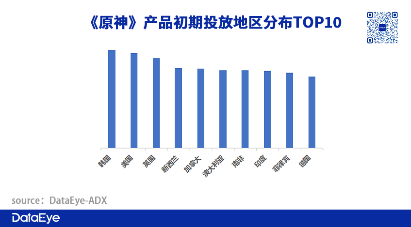 《原神》海外版实行了全地区同步上线,而在投放侧同样保持相对的一致。根据DataEye-ADX海外版显示,《原神》上线前30天投放地区分布均匀,没有明显的侧重,美国作为投放量较多的市场,占比仅为4.66%。