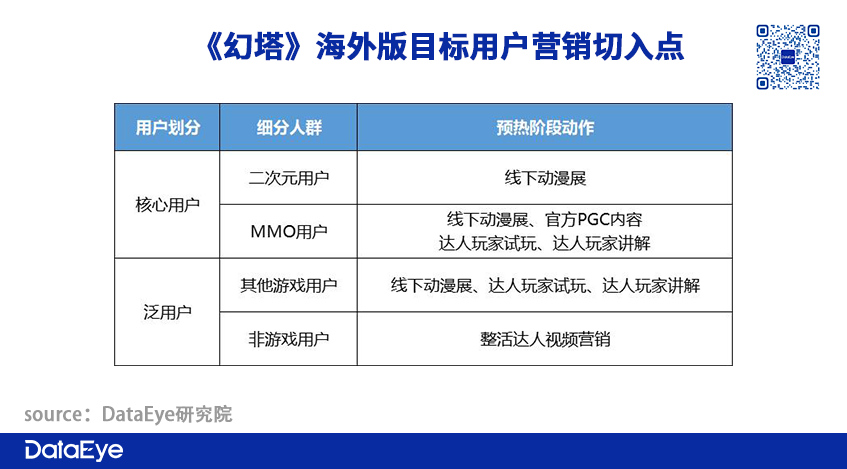 DataEye研究院分析认为,《幻塔》海外版在核心用户层面上,大致分为两类:二次元用户和MMO用户。次核心用户则为其他游戏用户与非游戏用户。因而项目组在传播侧进行有针对性的营销切入,具体如下:
