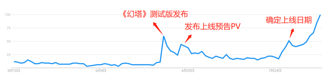 根据Google Trends数据显示,除了首次宣布品牌曝光之外,包括《幻塔》测试版发布、上线预告PV以及确定上线日期等,三个节点都给产品带来相对可观的热度。