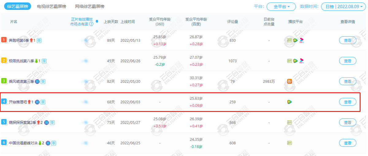 根据云合6月榜的数据,《开始推理吧》5月27日上线,6月播放量9189万,日均306.3万。截至完结,排名综艺霸屏榜第四。