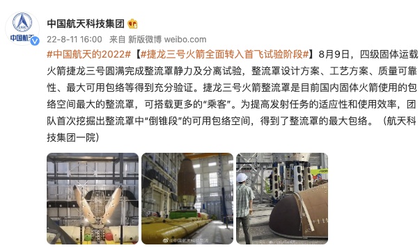 中国航天科技集团官微消息,8月9日,四级固体运载火箭捷龙三号圆满完成整流罩静力及分离试验,整流罩设计方案、工艺方案、质量可靠性、最大可用包络等得到充分验证。捷龙三号火箭整流罩是目前国内固体火箭使用的包络空间最大的整流罩,可搭载更多的“乘客”。