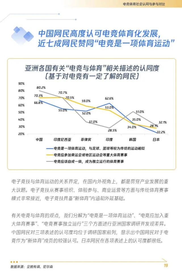 在《亚洲电竞运动行业发展报告》报告中,我们可以看到,在亚洲地区,中国对于“电竞与体育”相关描述的认同度最高,甚至远远超过了官方“举国之力”扶持电竞产业的韩国,和游戏热门市场日本。