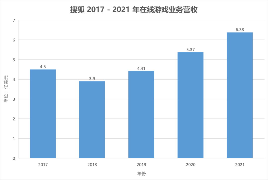 近几年来,搜狐的在线游戏业务收入连年上涨,2021年更是达到创纪录的6.38亿美元,占总收入的76.3%。