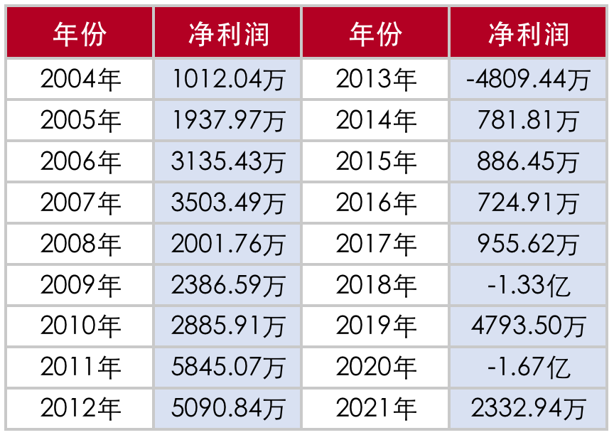 2020年再次大亏1.67亿元,2021年扭亏实现净利润2332.94万元,但仍不及2013年以前盈利水平。