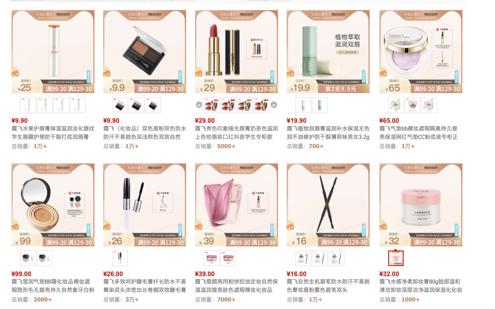 霞飞天猫旗舰店显示,该品牌目前有46款产品在列,产品价格普遍不超过40元。售价最高的是一款气垫BB霜,价格为99元。售价最低的产品有双色眉粉、润唇膏、粉扑和唇釉,价格为9.9元。在以批发为特色的1688网站上,霞飞的价格甚至更便宜。比如,原价65元的气垫CC霜只卖35元,三瓶起售。