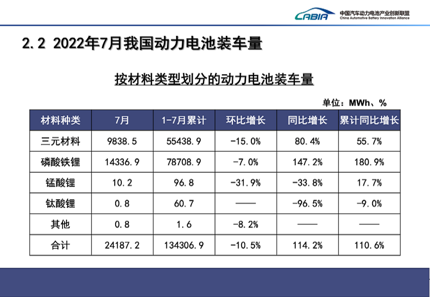 7月,国内动力电池装车总量为24.2 GWh,较6月下降10.5%。其中,磷酸铁锂电池占比59.3%,三元电池占比40.7%。自去年7月以来,国内磷酸铁锂电池的月度装车量已连续13个月超过三元电池。