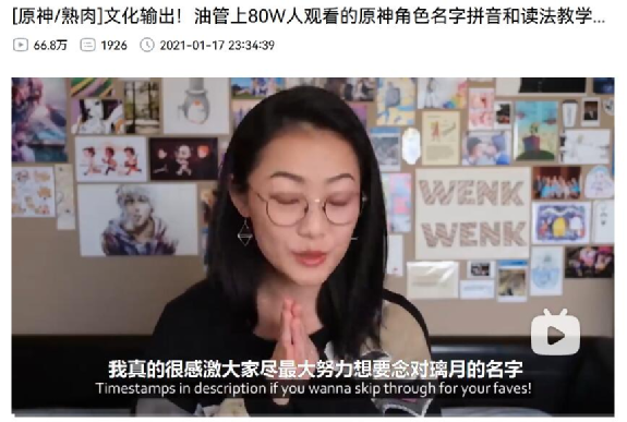老外们为了念对这些名字可谓四处求救。油管上一位好心小姐姐制作的《原神》拼音教学视频如今已获得了超260万的播放量,底下超过1万条评论都是老外在热烈交流学习汉语拼音的心得体会。有人将视频搬运到B站,也获得了66万播放量。玩家直呼这才是文化输出。