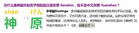 《原神》一开始就定下了多国多语音版本同步上线的发行策略。这对于国内二次元游戏来说还是史无前例的头一遭。游戏上线之后在海外的火爆更是让其成为2020年的现象级爆款。这时有趣的事情就发生了,那就是海外玩家面对游戏中大量的汉语拼音不知所措。