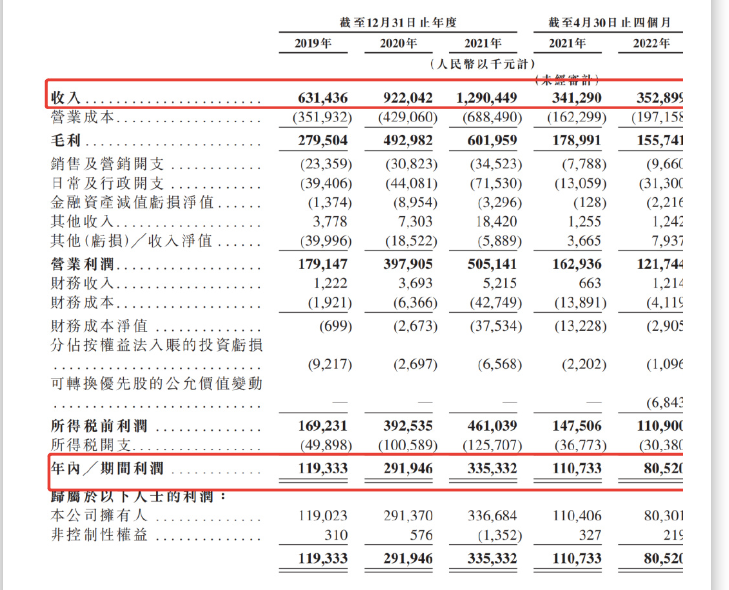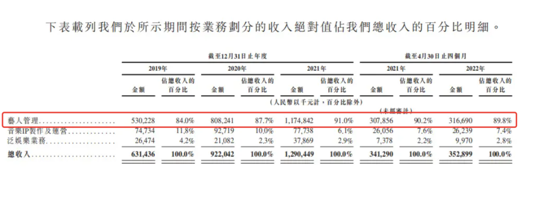 根据招股书数据显示,2019年~2022年前四个月,乐华娱乐艺人管理营收分别为5.3亿元、8.08亿元、11.74亿元、3.07亿元,分别占公司总营收的84.0%、87.7%、91.0%及89.8%。