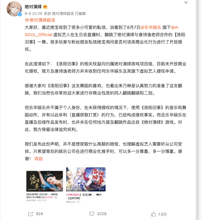 8月9日晚间,网易游戏“绝对演绎”发长文谴责乐华娱乐侵权,其旗下某虚拟偶像于8月7日在直播时翻跳“绝对演绎”与唐诗逸共同推出的游戏推广曲《洛阳旧事》,此次直播中共营收179w+人民币。在长文中,“绝对演绎”明确指出了“并未授权给乐华娱乐”。表演使用的音乐或舞蹈的版权问题,也是虚拟偶像直播必须要面对的。