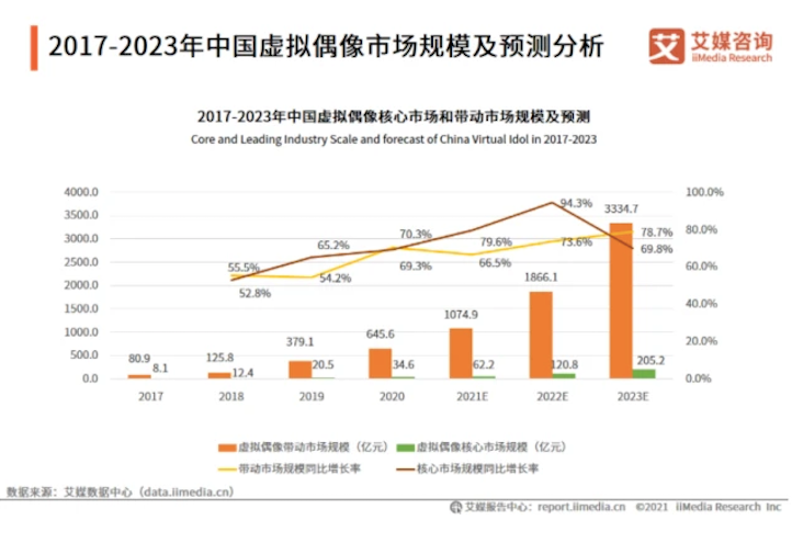 一度,虚拟偶像被视为“永不塌房”的艺人,偶像生涯的稳定性、长期性均优于真人,商业前景广阔。近年来,很多娱乐公司押注虚拟偶像产业,除乐华之外,腾讯、爱奇艺、小红书等均有布局。据艾媒咨询预计,2022年中国虚拟偶像核心产业市场规模为120.8亿元,预计2023年将达到205.2亿元——收入主要来源于直播打赏,商业合作等。