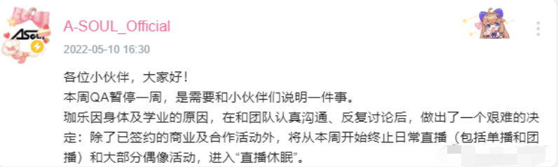 今年5月10日,虚拟偶像团体A-SOUL发布声明称,成员珈乐因身体和学业原因,将从本周开始终止日常直播和大部分偶像活动,进入“直播休眠”。并解释称,“直播休眠”并不等于退出A-SOUL,不会启用别的演员,也不会有新角色加入替代珈乐。