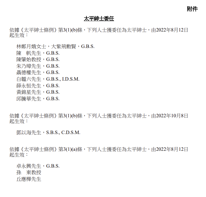 香港特区政府网站8月12日消息,港府今日于宪报刊登太平绅士委任名单,共有13人,包括上一任香港特区行政长官林郑月娥。