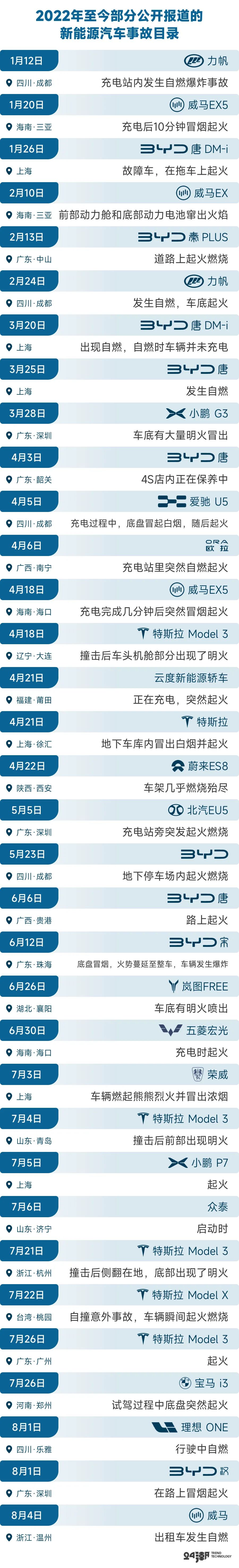 24潮团队统计了今年至今的引发公众较大关注的新能源汽车起火事件,剔除了传言及疑似事件,包含时间、地点、车型等三要素的起火事故共有34起(部分事故尚不明确是否为车辆自身问题)。