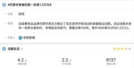比如,有关破烂鞋的新闻爆出来后,短短几天内#巴黎世家破烂鞋一双卖1.2万元#的微博话题内容阅读量已经超过4.2亿。而这款鞋,也成为了历史上流量最高的“破鞋”之一,为品牌带来的极高的关注度。