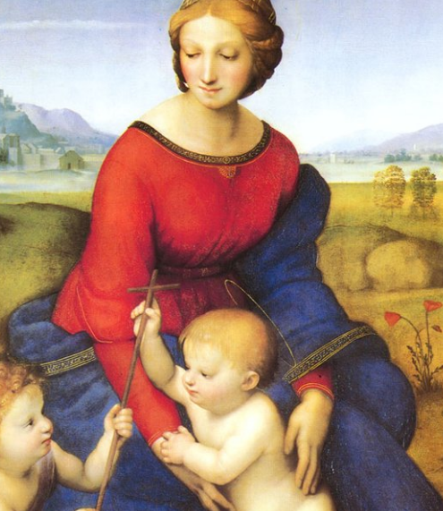 拉斐尔的名作《草地上的圣母》,画中的圣母完全是一名普通的意大利妇女形象,目光温柔地注视着圣婴。和刻板的中世纪宗教画相比,拉斐尔的作品将圣母身为女性的美刻画地淋漓尽致。