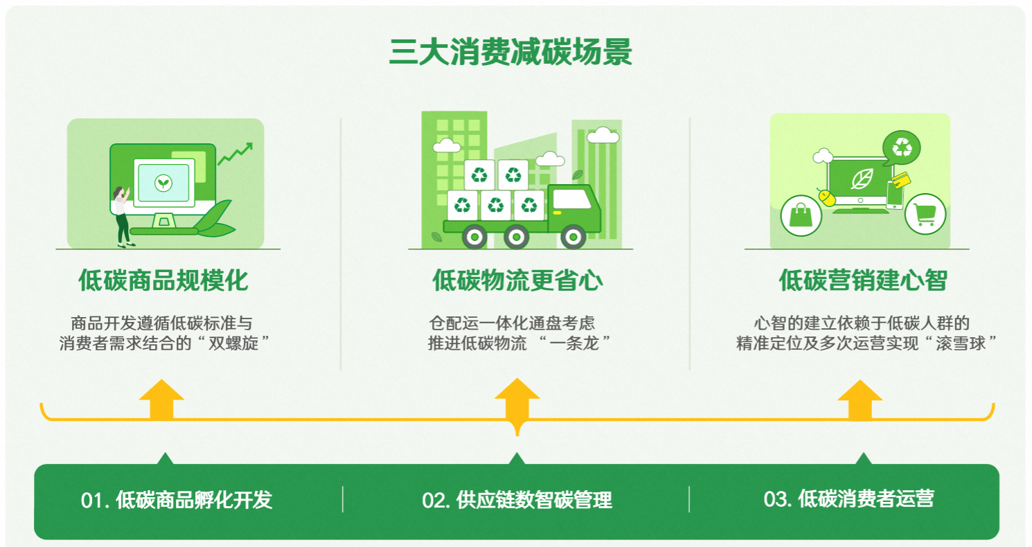 在“减碳友好行动”聚焦的三大消费减碳场景,阿里巴巴有较为成熟的数字化能力。在低碳商品方面,以天猫新品创新中心(TMIC)为例,将与品牌的产品开发部门合作,共建低碳商品标准,共同开发低碳商品,增加低碳商品数量。在低碳物流方面,菜鸟将与品牌的供应链部门共同设计低碳物流方案,短期提升原箱发货与循环箱使用量,在中长期实现物流环节碳排放的显著降低。在低碳心智打造上,天猫、饿了么等将与品牌的市场部门合作,在消费者中树立低碳消费观念。