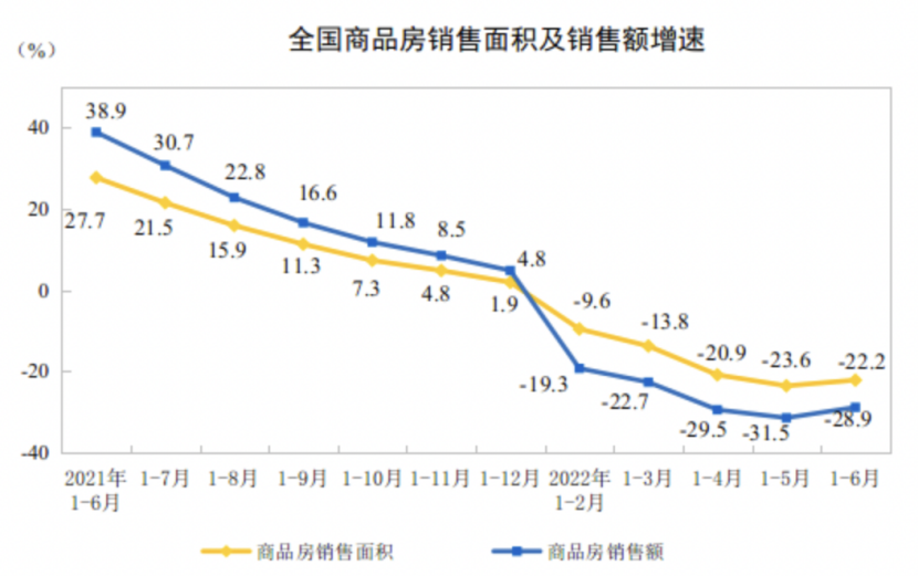 而从楼市来看,市场景气度下降也加剧了提前还贷情绪。根据国家统计局的统计,今年上半年,全国商品房销售面积68923万平方米,同比下降22.2%;商品房销售额66072亿元,下降28.9%。