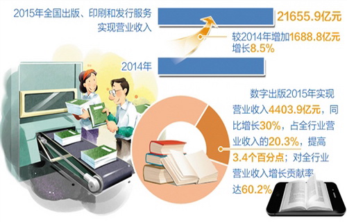 过去的一年,新闻出版产业继续保持较快增长,营业收入突破2.1万亿元。”国家新闻出版广电总局今天发布的《2015年新闻出版产业分析报告》显示,2015年全国出版、印刷和发行服务实现营业收入21655.9亿元。