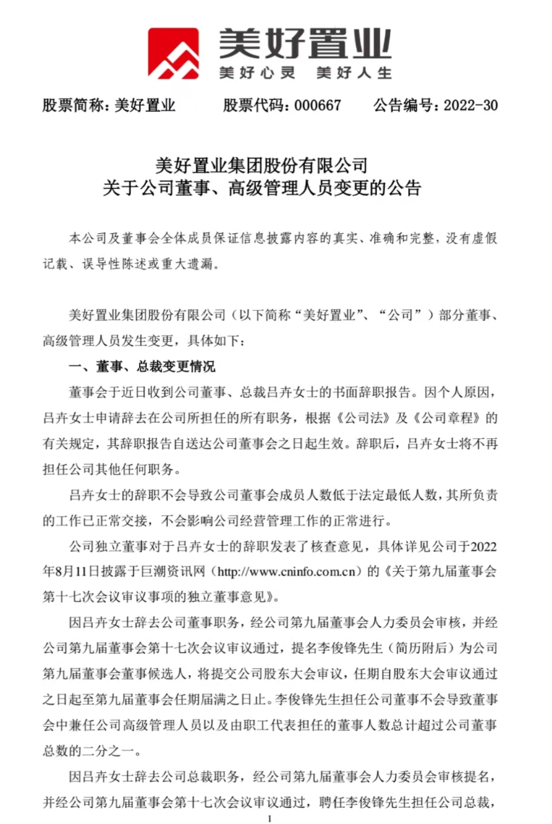 8月11日,美好置业公布了一项重要人事变动,吕卉辞任副董事长、董事、审计委员会委员、总裁、投资委员会委员等职位。