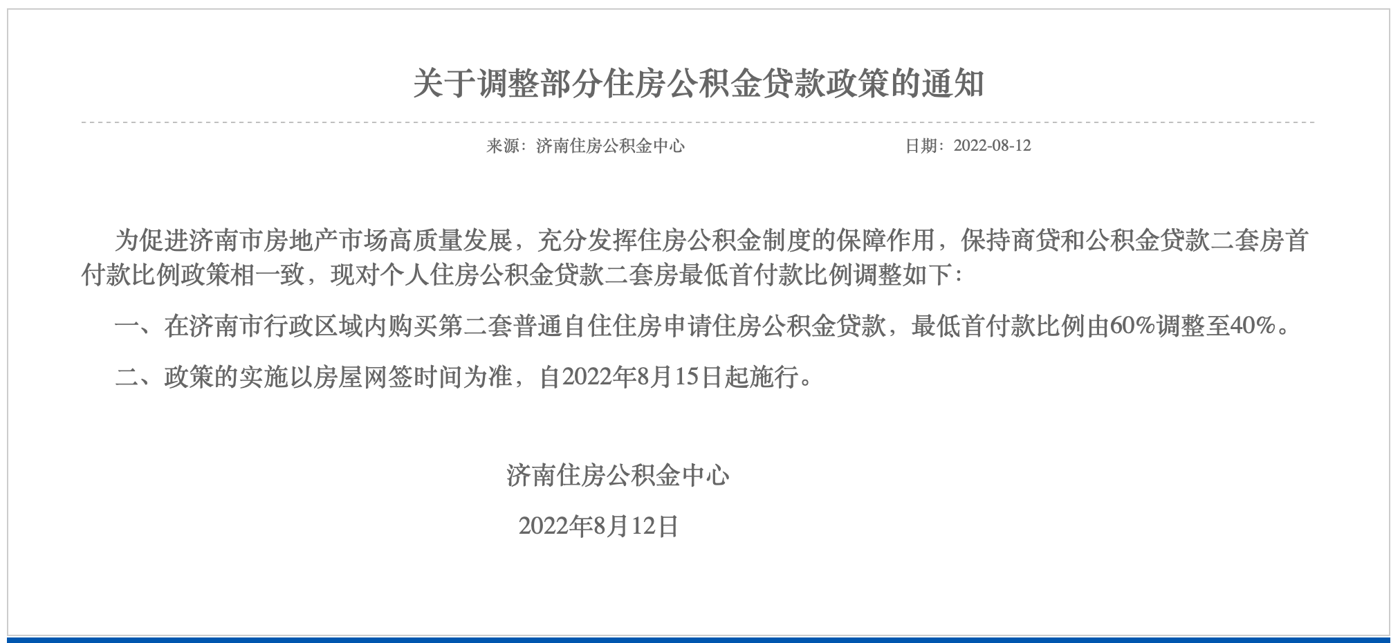 据济南住房公积金中心官网消息,为促进济南市房地产市场高质量发展,充分发挥住房公积金制度的保障作用,保持商贷和公积金贷款二套房首付款比例政策相一致,现对个人住房公积金贷款二套房最低首付款比例调整如下: