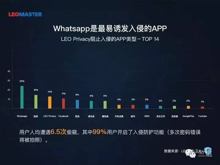 从数据来看,上半年用户人均遭遇6.5次偷窥,其中99%的用户开启了入侵防护功能(多次密码错误将被拍照)。而在众多应用中,聊天软件、相册、通讯工具的入侵次数较多,其中,WhatsApp是最易诱发入侵的APP达到了25%。