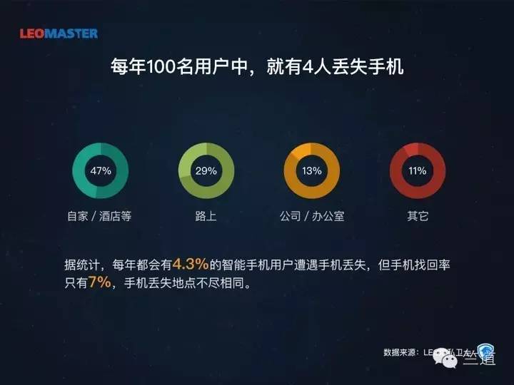每年都有4.3%的智能手机用户会遭遇手机丢失,但手机找回的概率仅有7%。大家在自家/酒店等场所丢失手机的几率最大,占比47%。其次在路上、公司/办公室等场所中也比较容易丢手机。