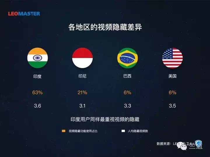 印度用户是全球最爱隐藏视频的手机用户群体,63%的用户隐藏手机视频,遥遥领先其他国家。平均每人隐藏3.6个手机视频占全球最高。
