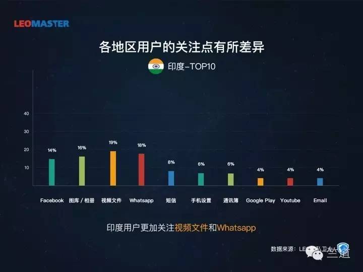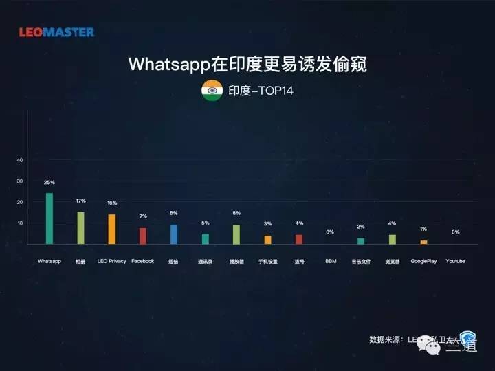 不同国家用户被偷窥的APP不尽相同,在印度用户最容易被偷窥的APP是WhatsApp(25%),其次是个人相片(17%),其他还包括Facebook(7%)、短信(8%)、视频(8%)……。