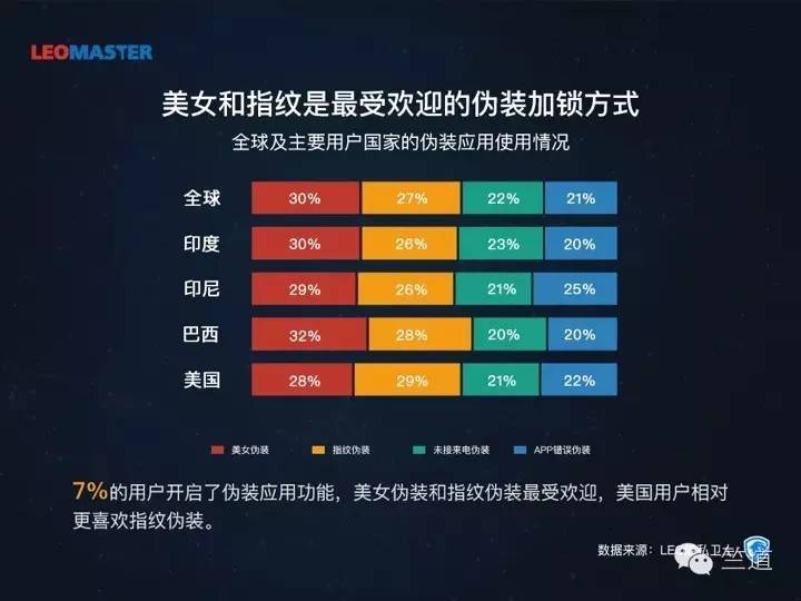 全球有7%的用户开启了伪装应用功能,在这些国家地区中,美女和指纹的伪装加锁方式是最受印度用户喜爱的伪装方式,当然了其他国家的用户也喜欢。