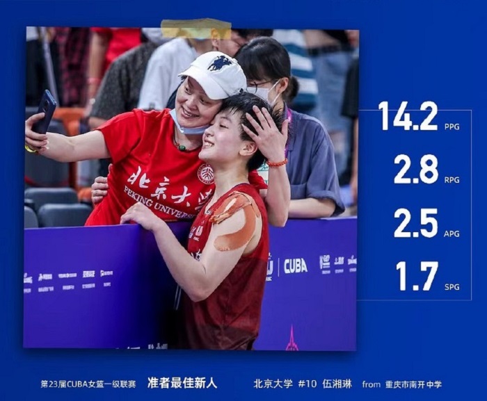而在CUBA联赛中获得了第三名的北大女篮中,大二的伍湘琳是队伍里的首发后卫。去年在自己的CUBA第一季中,伍湘琳就以场均14分拿到了CUBA最佳新人。