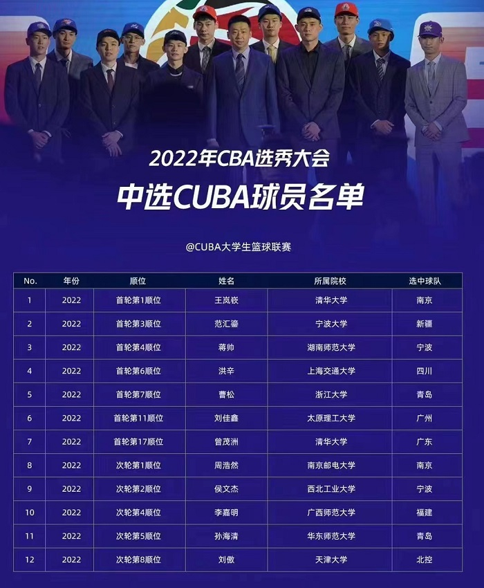 2022年7月24日,本届CBA选秀大会,作为清华男篮头号球星的王岚嵚“状元”中选,同时被选中的清华男篮成员还有首轮第17顺位被广东宏远选中的曾茂洲。