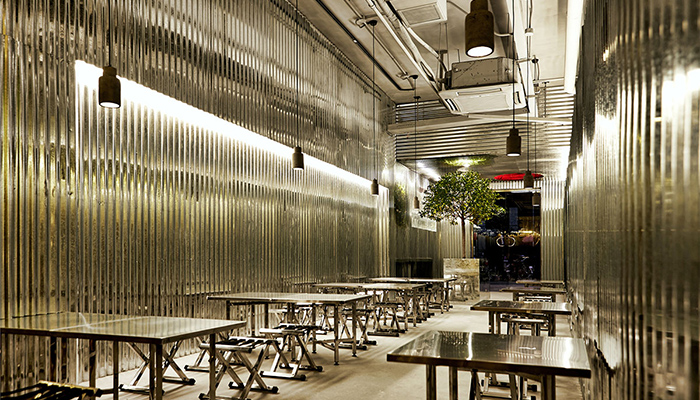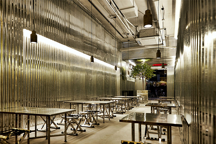 Lucky 烧烤吧由建筑工作室 robot 3 工作室打造,整个餐厅的面积只有 52平米(不包括厨房),由拉面馆改造而成,空间狭小、预算紧张、位置偏僻成了这烧烤吧的弱势标签。但能够让其成为网络红店的标签是:这家烧烤吧由全金属打造而成。