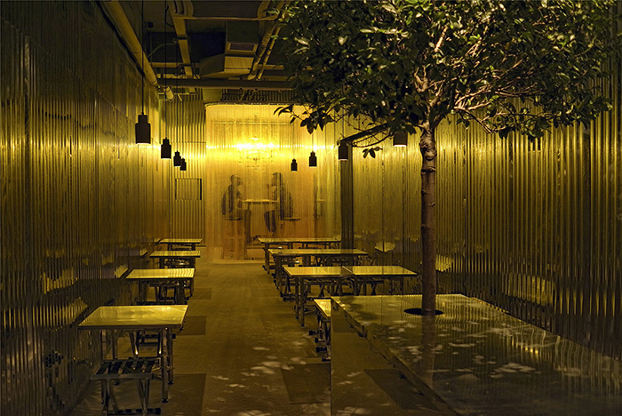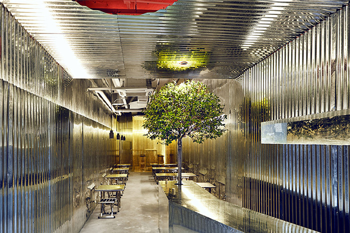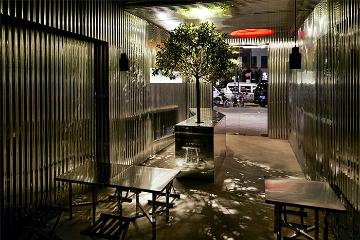 烧烤吧由金属材料打造而成,“材料是词语,而词语没有优劣。我们选择了几个不常用的材料,以铁板作主语,软帘作定语,一棵真树作为谓语。用金属去守护自然。”设计师如是说。不同寻常的全金属设计,让这间铁皮屋看上去摇滚味十足。