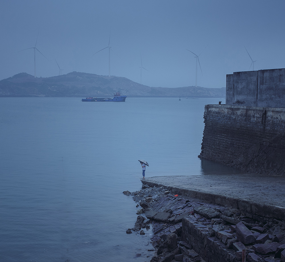 这是南日岛的石南码头,由于潮水、风雨、烈日和潮湿空气的浸洗,石墙石阶已经发黑。暴雨将至,天色黑沉沉压下来,小渔船泊在码头边,随潮起伏。码头一旁的海岸是平缓的海滩,叶片细长的巨大风车,拉开间隔,沿岸树立,那是岛上的风力发电机组。