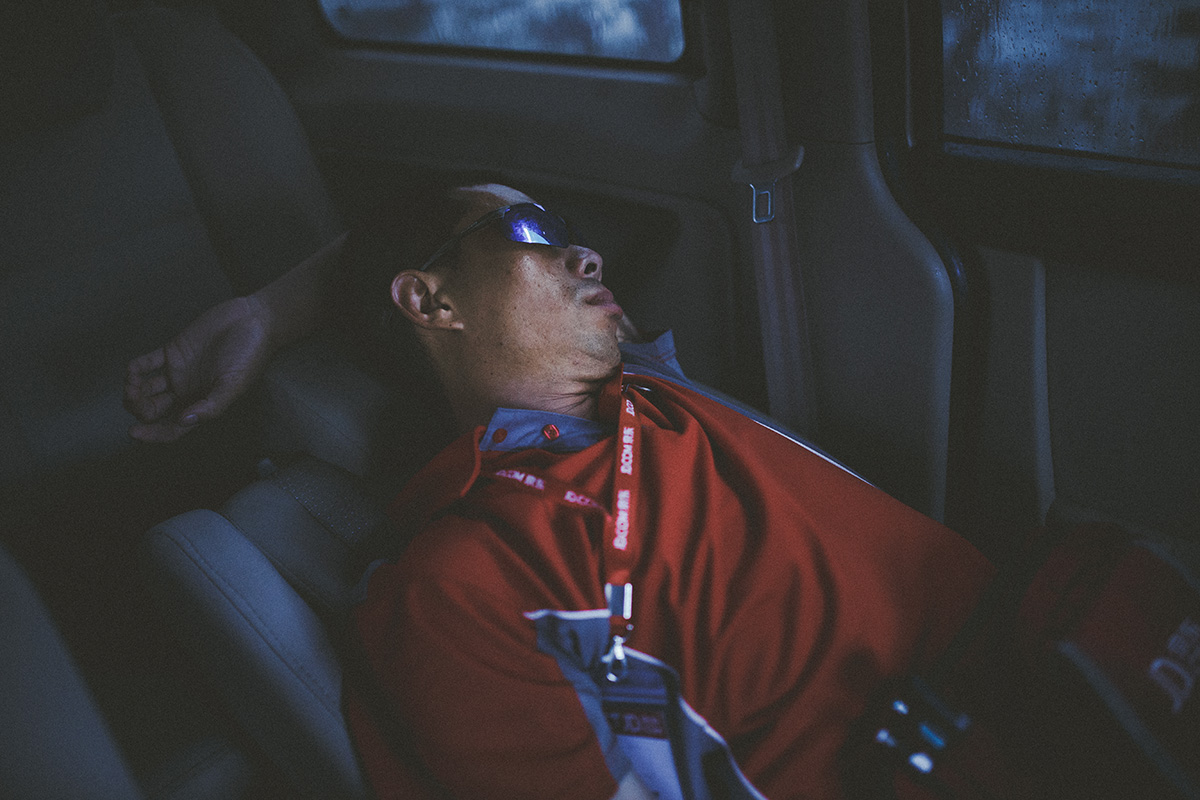 在码头排队等船时,下起了雨,石师傅坐回车上观望。一时半会儿,不会来船了,他戴上墨镜遮光,放平座椅靠背,用胳膊枕着头打盹。雨点打在车顶棚,他躺了一会儿,突然又坐直起来,向前张望。大多时候,他根本就睡不着。