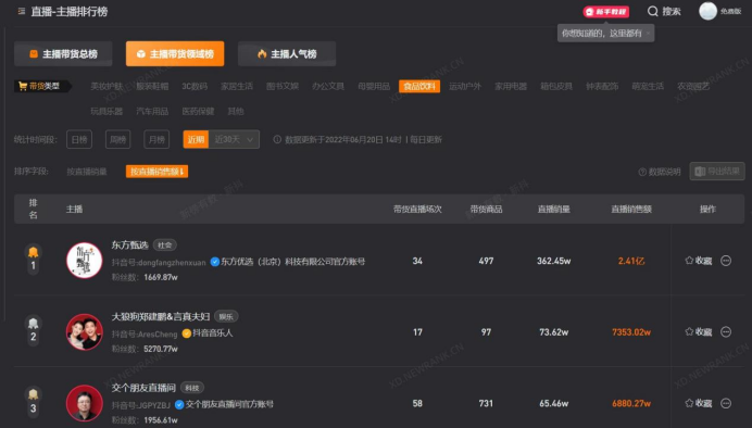 靠着双语直播的独辟蹊径,东方甄选很快在抖音带货届占据了一席之地。据新抖数据显示,6月20日东方甄选以2.41亿的销售额排名第一,力压了罗永浩曾经的“交个朋友直播间”。