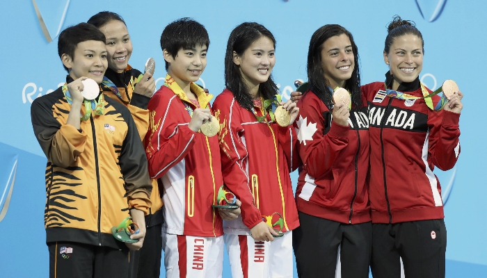 此外,马来西亚组合潘德莉拉/张俊虹和加拿大组合本菲托/费丽恩,分获女子双人10米台的银牌和铜牌。