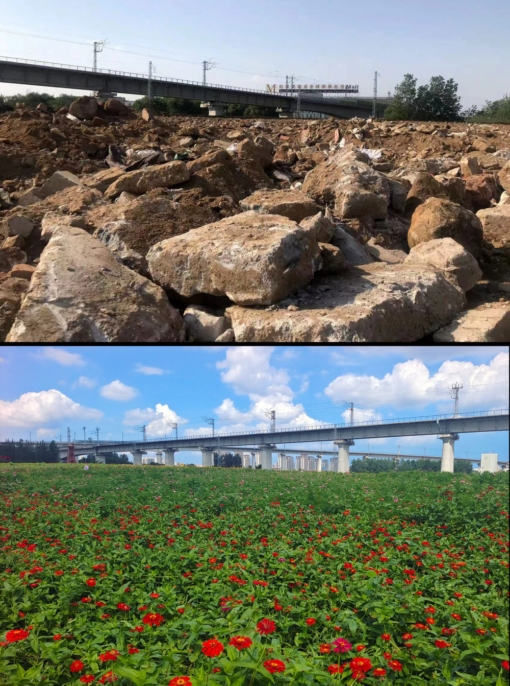 夏日午后,波斯菊和步登高竞相开放。这片位于山东省日照市东港区迎宾路和青盐高铁交会而成的11万平方米长方形地带,曾经堆满建筑垃圾和渣土,犹如“城市疮疤”让城市管理者伤透脑筋。