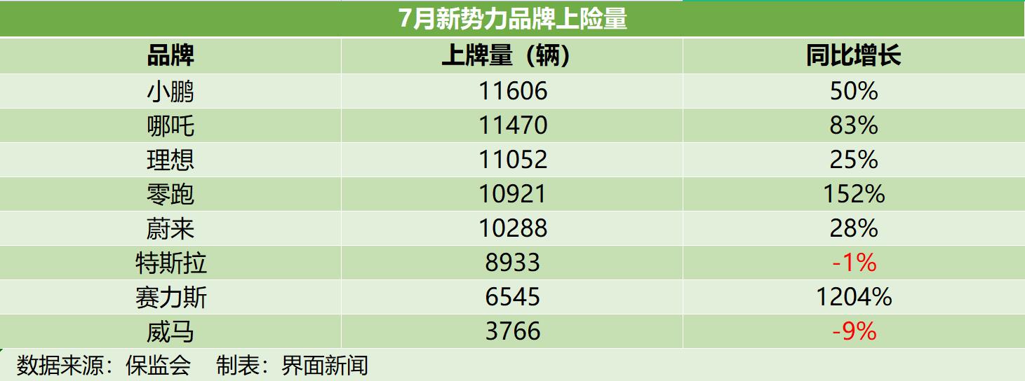 新势力品牌也取得了不错的市场表现,7月新势力品牌累计上险量达7.8万辆,同比增长55%。其中,排名前四的小鹏、哪吒、理想与零跑7月上险量都在1.1万辆上下,排在第五的蔚来也突破1万大关。