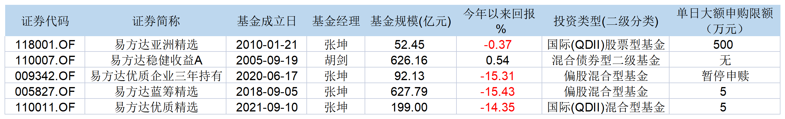 张坤管理的四只基金中,除了易方达优质企业三年持有仍处于封闭期外,易方达蓝筹精选、易方达优质精选保持着单日5万元的申购上限。