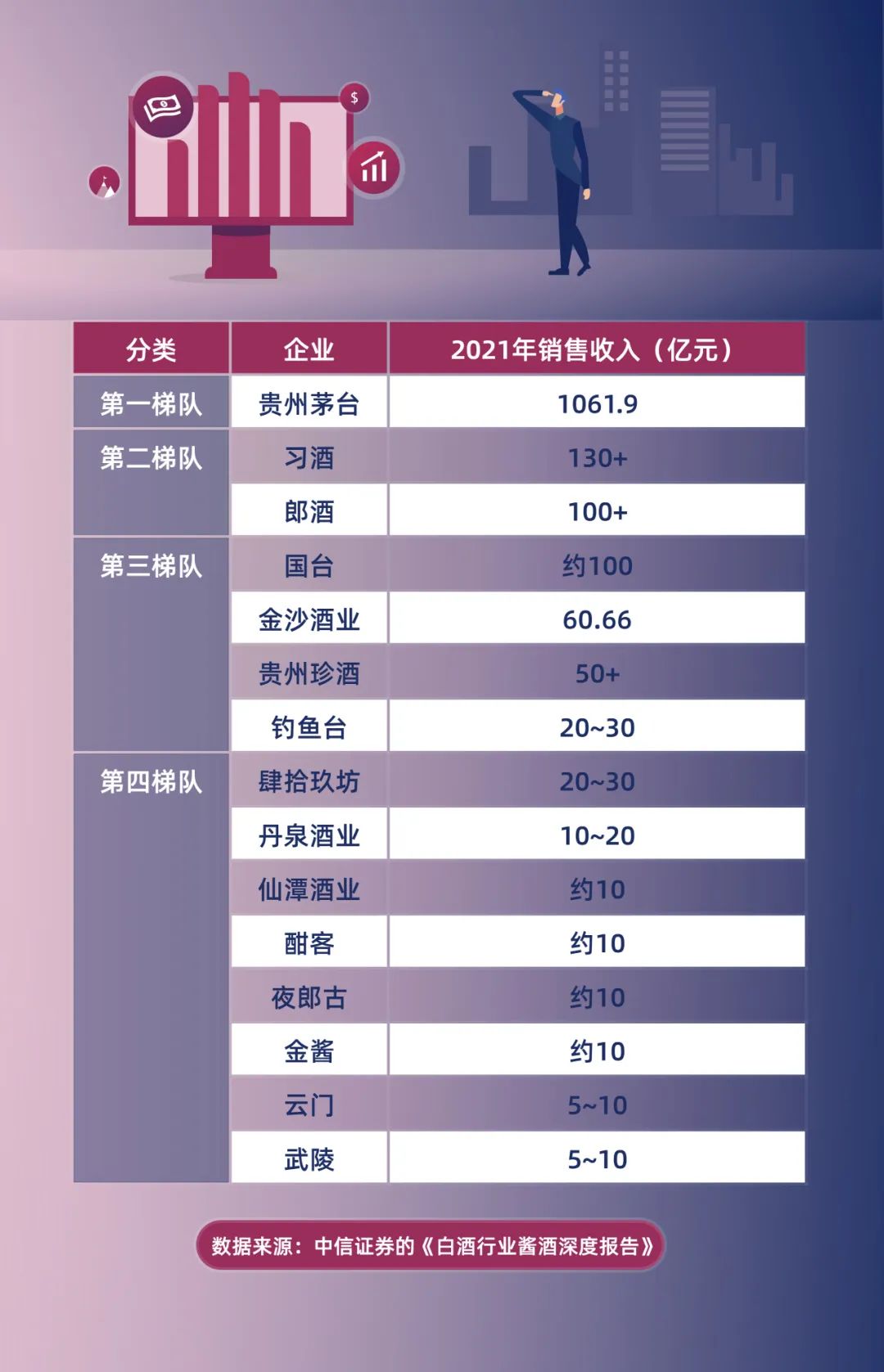 今年5月,中信证券发布了《白酒行业酱酒深度报告》,从中能够一窥当前酱酒企业的竞争格局。即使除开头部的贵州茅台、习酒、郎酒三家企业,第三、四梯队的酱酒企业也在2021年实现了超过310亿元的销售收入。