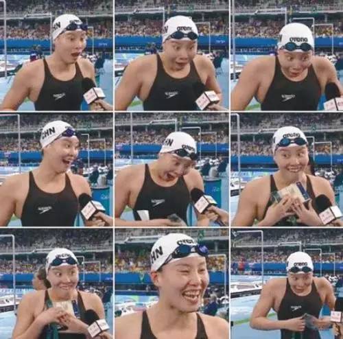 58秒95,这是傅园慧第一次游进59秒。“58秒95?啊?我以为是59秒。我有这么快?我很满意!”赛后采访时,这个20岁的杭州姑娘表情满满,每一帧画面都是自带表情包。这段采访播出后,傅园慧被誉为“行走的表情包”。