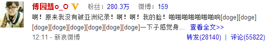 率性、开朗、更重要的是又自带表情包,“洪荒girl”瞬间成了二次元创作者们的源泉,红遍全中国。昨天下午1时,傅园慧的微博粉丝还只有19万。一夜之间,粉丝数激增至280.3万,成为今夏最火的网红。