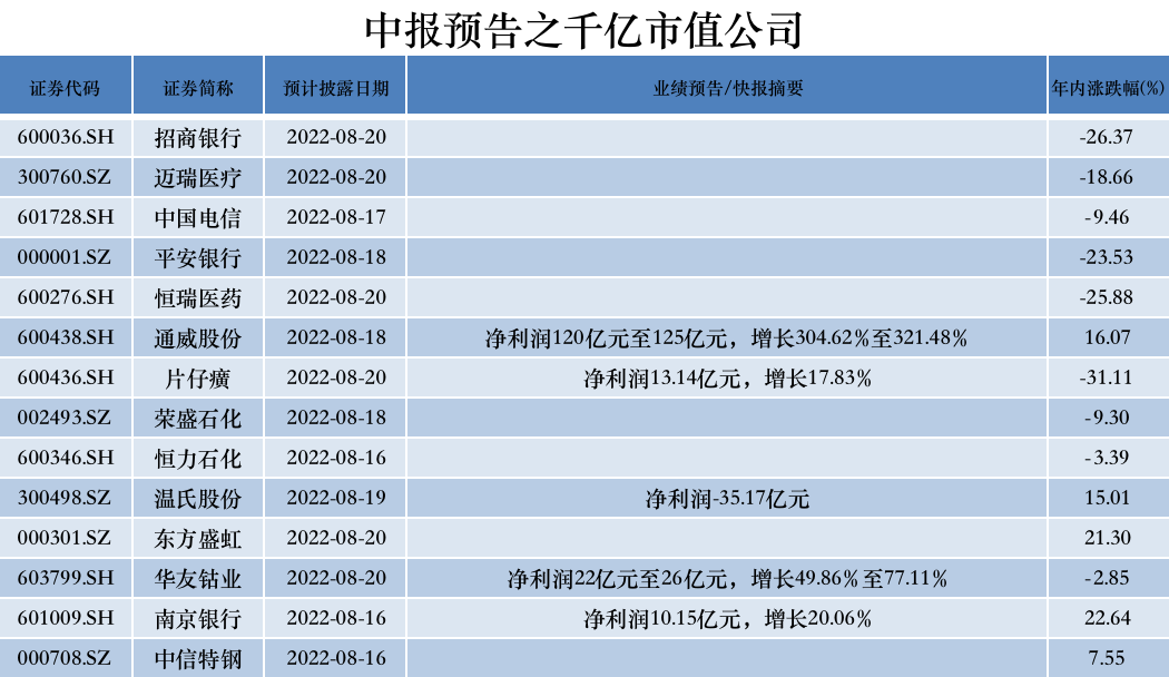 本周有包括迈瑞医疗(300760.SZ)、中国电信(601728.SH)、恒瑞医药(600276.SH)、通威股份(600438.SH)、片仔癀(600436.SH)、荣盛石化(002493.SZ)、恒力石化(600346.SH)、温氏股份(300498.SZ)、华友钴业(603799.SH)等在内的14家市值超过千亿元的公司将披露中报业绩。