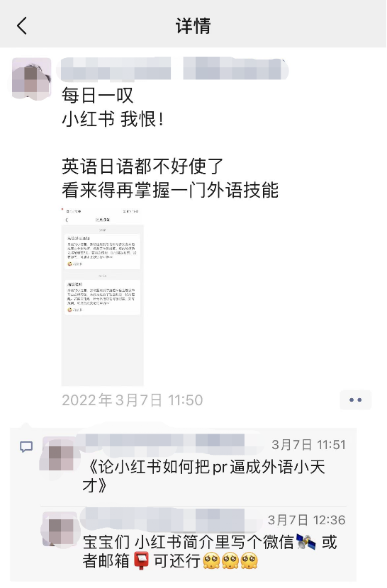 小奶茶给陆玖商业评论展示了自己加的一个某零食品牌PR,因为其通过私信联系博主经常收到官方的封禁,不得已开始使用外语来和博主联系寻求合作,还发朋友圈诉苦称:“论小红书如何把PR逼成外语小天才。”
