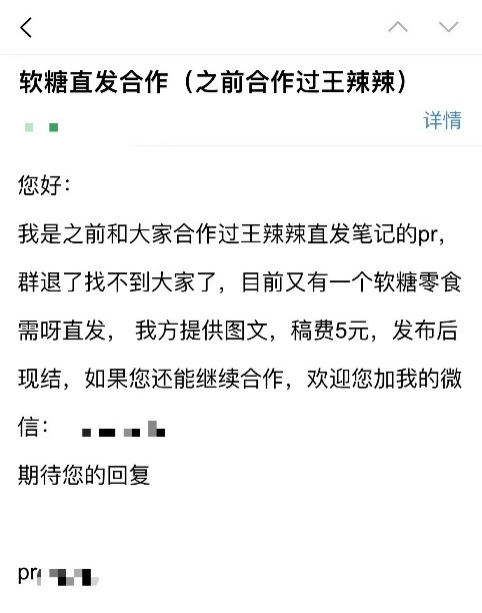 小红书素人博主小刘则分享了自己的亲身经历:某品牌PR给她发邮件称需要软糖零食图文直发,由品牌这边提供内容,博主只需要发布即可,稿费5元,发布后现结。小刘对此感到非常不解,“之前有品牌合作,还会寄送产品试用,现在连产品都不用见到,就可以直接发内容了,这样的操作难道不违规吗?完全违背了分享自己生活的初衷啊。”