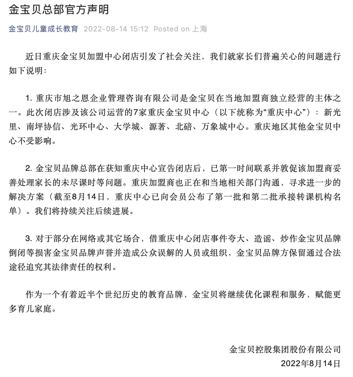 “金宝贝儿童成长教育”微信公众号消息,8月14日,金宝贝总部发布声明称,重庆市旭之恩企业管理咨询有限公司是金宝贝在当地加盟商独立经营的主体之一。此次闭店涉及该公司运营的7家重庆金宝贝中心(以下统称为“重庆中心”):新光里、南坪协信、光环中心、大学城、源著、北碚、万象城中心。重庆地区其他金宝贝中心不受影响。