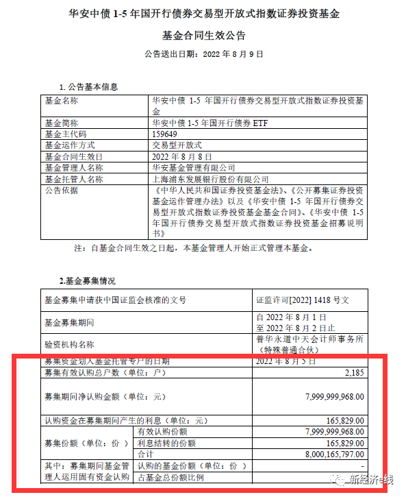 8月5日,华安基金发布的华安中债1-5年国开债ETF现金认购申请确认比例结果公告表明,基金登记机构对2022年8月2日有效认购申请采用“末日比例确认”的原则予以部分确认。本基金2022年8月2日有效认购申请确认比例为98.43846491%。8月9日,华安中债1-5 年国开债ETF率先宣告基金合同于8月8日正式生效,募集份额略超80亿份。基金募集有效认购总户数2185户,户均认购份额约366.21万份。